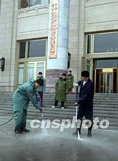 工作人員二十三日在北京人民大會堂門外清理地面灰塵,迎接將于三月初召開的第十屆全國人民代表大會與全國政協(xié)十屆會議。作者:毛建軍