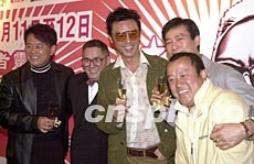 香港著名音樂(lè)人黃沾2月25日舉行《黃沾「獅子山下」演唱會(huì)》記者會(huì),曾志偉、鄭少秋、鍾鎮(zhèn)濤、陳百祥(右起)上臺(tái)與黃沾祝酒。鄧慶樂(lè) 攝