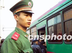二月二十六日,中國(guó)“兩會(huì)”即將召開(kāi),一名武警在北京巴士車站維持秩序。作者:杜洋