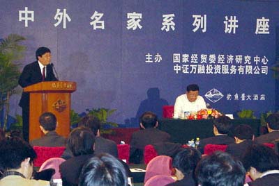 據(jù)了解,“中外名家系列講座”是由國(guó)家經(jīng)貿(mào)委經(jīng)濟(jì)研究中心和中證萬融投資服務(wù)有限公司聯(lián)合主辦。自2001年9月起已舉辦了37期(每月2期),受到社會(huì)各界特別是企業(yè)界的廣泛好評(píng)。參加此期講座的嘉賓中,有來自企業(yè)界的知名人士及各大媒體領(lǐng)導(dǎo)。此期講座由專項(xiàng)部主任支東升主持。