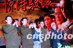 由八一電影制片廠推出的再現(xiàn)1998年全國軍民與大洪水英勇抗爭的大型電影故事片《驚濤駭浪》首映式,28日在北京人民大會堂隆重舉行。圖為影片主要演員于洋、巫剛、寧靜等在首映式上與觀眾見面。作者:張勤