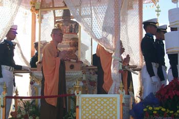 今天早上,泰國曼谷空軍機場舉行了隆重的送歸儀式。泰國文化部長烏萊婉致詞,她以泰國政府、佛教界和全國人民的名義,衷心感謝中國政府為慶祝泰國國王陛下75圣壽大吉,同意佛牙舍利自2002年12月15日至2003年2月28日共76天,赴泰佛統(tǒng)府佛教城臨時供奉76天。她說,供奉期間,泰國人民前往佛教城舉行各種各樣的參拜活動。泰國王儲殿下于1月9日代表國王陛下前往參拜,泰國佛教最高領(lǐng)袖僧王兩次參拜,泰國樞密院主席、國會主席、上議院主席、內(nèi)閣主要領(lǐng)導人以及眾多議員都前往參拜。在佛牙舍利臨時赴泰供奉事宜圓滿成功之際,泰國政府對中國政府和人民以及中國佛教協(xié)會表示衷心的感謝,并祝愿泰中友好萬古長青。