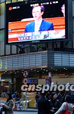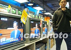 素有購物天堂美譽的香港,商家關(guān)注稅務(wù)制度改革。三月五日公布的香港2003至2004年度財政預(yù)算案成為此間商家關(guān)注熱點,圖為電器店里的電視機播出財政司司長梁錦松提交的預(yù)算報告。潘索菲 攝