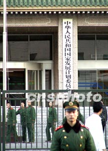 備受各界關(guān)注的國務(wù)院機(jī)構(gòu)改革方案六日上午提請(qǐng)十屆全國人大一次會(huì)議審議。根據(jù)這一方案,國家發(fā)展計(jì)劃委員會(huì)將改組為國家發(fā)展和改革委員會(huì),以完善宏觀調(diào)控體系。圖為武警戰(zhàn)士三月在國家計(jì)委前執(zhí)勤。作者:羅杰