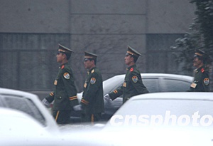 三月六日清晨北京瑞雪紛飛,在全國(guó)人大十屆一次會(huì)議駐地的軍警冒雪巡邏。作者:賈國(guó)榮