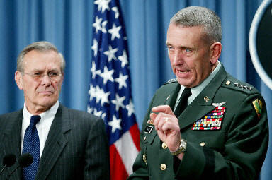 3月5日,在美國華盛頓五角大樓,美國國防部長拉姆斯菲爾德(左)和美國中央司令部司令弗蘭克斯出席記者招待會。弗蘭克斯說,美軍目前已經(jīng)為對伊拉克采取軍事行動作好了準(zhǔn)備。