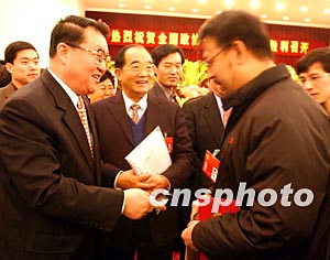 中共中央政治局常委李長(zhǎng)春三月七日到政協(xié)十屆一次會(huì)議文化藝術(shù)界聽取委員們的建議意見后,與電影演員兼導(dǎo)演的姜文交談。作者:賈國(guó)榮