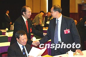正在北京出席全國(guó)政協(xié)十屆一次會(huì)議的何鴻燊與鄒哲開在港澳政協(xié)委員聯(lián)組會(huì)上互致問候。作者:毛建軍