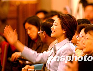 中國中央電視臺(tái)的節(jié)目主持人王小丫三月在北京采訪全國人大十屆一次會(huì)議的記者招待會(huì),前一天九次舉手未獲提問機(jī)會(huì),如今終于如愿以償。作者:賈國榮