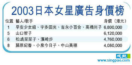至于兩位叱咤樂壇的歌姬濱崎步及宇多田光,前者靠百變形象,成功令三百四十萬的身價,上升多一百三十六萬港元。而光妹則以低調(diào)及神秘感取勝,成為廣告一姐。事實上,據(jù)最新一期雜志《女性自身》報道,光妹婚后明顯發(fā)福,也與其深居簡出的生活習慣有關。