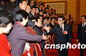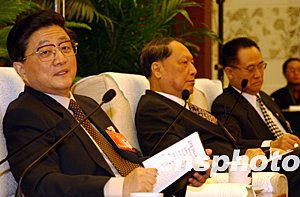 今天是十屆全國人大第一次會議河北團(tuán)全體會議,中共中央政治局常委黃菊與代表們共同審議。
