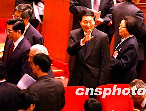 朱鎔基總理三月十四日在北京人民大會(huì)堂出席十屆全國(guó)政協(xié)一次會(huì)議閉幕式,最后離場(chǎng)時(shí)俯身抱拳向委員們祝福。