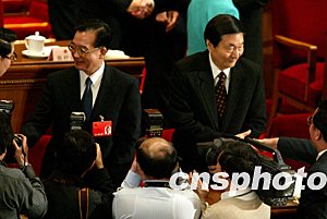 溫家寶和朱鎔基一同接受代表祝賀。作者:鄭萍萍