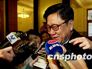 交通部部長(zhǎng)張春賢三月十七日出席十屆全國(guó)人大一次會(huì)議時(shí)接受中外記者采訪。作者:張煒
