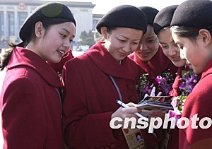 十屆全國人大一次會議第七次全體會議十七日在北京人民大會堂召開,圖為會議禮儀小姐在翻看與代表的合影。作者:廖文靜