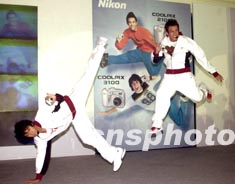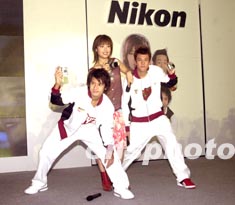 人氣新組合Boy'Z兩名成員關智斌(Kenny) (左)、張致恒(Steven) 3月17日晚在香港出席Nikon全新相機新聞發(fā)布會。出道不久但人氣急升的Boy'Z兩名成員,以充滿活力的高難度動作為Nikon展示COOLPIX 2100及COOLPIX 3100數碼相機。鄧慶樂 攝