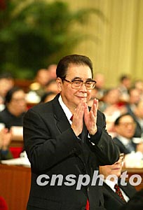 十屆全國(guó)人大一次會(huì)議十八日在北京人民大會(huì)堂閉幕,參加會(huì)議的前委員長(zhǎng)李鵬起立向代表們致意。作者:毛建軍