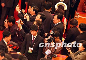 人大代表們?nèi)率巳赵诒本﹨⒓尤珖?guó)人大十屆一次會(huì)議的閉幕大會(huì)前,紛紛拍照留念。作者:賈國(guó)榮