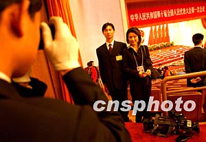 在三月北京舉行的十屆全國人大一次會(huì)議閉幕前,工作人員與CCTV主持人王小丫合影留念。作者:賈國榮