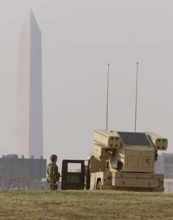 中新網(wǎng)3月19日電 由于美伊戰(zhàn)爭一觸即發(fā),美國政府對其本土也加強了防御,以對付可能發(fā)生的恐怖襲擊。圖為當?shù)貢r間3月18日,美軍在華盛頓的一個山坡上部署“復(fù)仇者”地對空導(dǎo)彈,遠處的華盛頓紀念碑依稀可見。(固山)