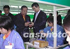 泰國華人青年商會潮汕地區(qū)經(jīng)濟文化訪問團三月二十八日在廣東汕頭參觀奧迪玩具實業(yè)有限公司。該公司總經(jīng)理蔡東青(后左三)向訪問團團長李桂雄(后左二)介紹情況。作者:王惠存