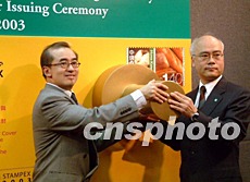 香港郵政4月4日發(fā)行紀念封,紀念香港郵政參與由香港郵學(xué)會主辦的香港郵展2003。圖為香港郵政副署長曾國林及香港郵學(xué)會張文德醫(yī)生在紀念封上蓋印。作者:洪少葵