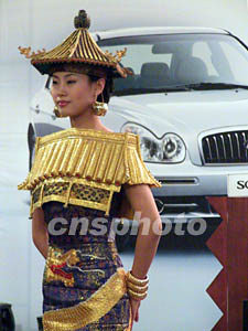 北京一家汽車俱樂部在四月春日請(qǐng)身穿仿中國(guó)宮廷建筑服飾的時(shí)裝模特,以服飾的華麗高貴為新興的時(shí)尚汽車生活助興。作者:王麗南