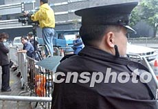 四月七日香港歌迷告別巨星張國榮追悼會將在香港殯儀館舉行,在殯儀館前警察加強警衛(wèi) 。錢興強 攝
