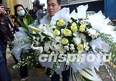 四月七日在香港殯儀館前,香港藝員譚詠麟為悼念張國榮逝世送來花籃“張國榮先生千古,永遠懷念你”。 錢興強 攝