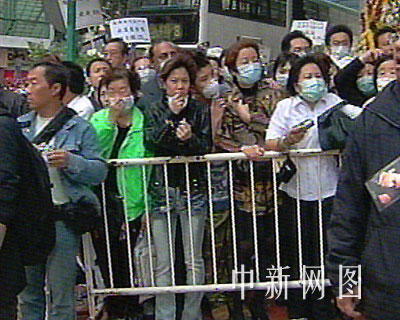 中新網(wǎng)4月8日電 香港著名藝人張國(guó)榮8日中午舉殯,近千名歌迷影迷冒雨在殯儀館外,目送“哥哥”的靈柩由靈車送往火葬場(chǎng)火化。