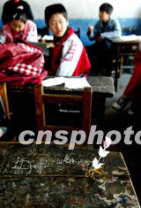 遼寧海城市鐵西小學六年級三班學生在李洋生前的課桌上擺上塑料花,表示哀悼。這是“三·一九”豆奶事件中惟一一例死亡事件,但官方稱,尚不能確定死亡原因是否和豆奶中毒有關(guān)。作者:鄭萍萍