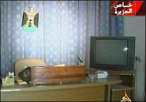 其中一個房間是一個裝飾有伊拉克鷹的簡陋的錄像室。他可能在這里錄下了他的“不投降”的電視講話。后面的背景窗簾正好和發(fā)表講話那天的背景一致。在一臨時會議室里有塑料椅子和鋪著床單的桌子,在另一房間里則還有放著皺巴巴的毯子的一些床鋪。(春風)