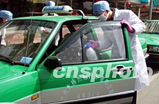 甘肅蘭州市疾病預(yù)防控制中心,近日對(duì)該市所有的士進(jìn)行消毒,以預(yù)防“非典型肺炎”的發(fā)生。作者:劉呈軍