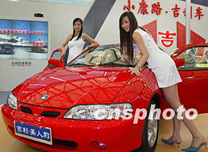 中國吉利集團生產(chǎn)的雙門跑車二十一日亮相上海第十屆國際汽車展覽會,十分搶眼。作者:趙振清