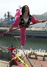 “高空飛燕”王海燕二十八日在深圳明思克航母熱身。她將在航母?罩g高六十米、長二百多米、直徑二十一點(diǎn)五毫米的鋼索上生存三十一天。作者:陳文