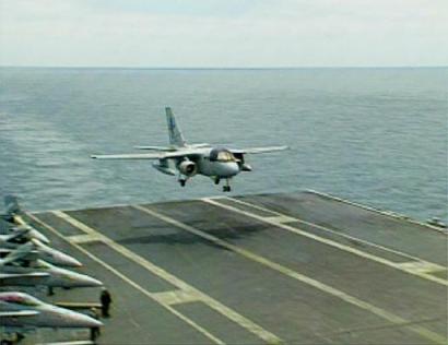 查資料才發(fā)現(xiàn),做好防護準備是有道理的:布什坐的S-3B“海盜式”噴氣式偵察機,采用“攔截式”方法在航空母艦上降落。也就是說,飛機以二、三百公里的時速著陸時,要靠飛機的制動勾抓住攔截索,產(chǎn)生阻力,在一百多米內(nèi)的航母甲板跑道上完全停住。四月一日,對伊戰(zhàn)爭期間,有過一架同類型的S-3B飛機,降落時沒停住,從“星座號”航空母艦上滑到了海里。