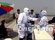 中國交通部五月再令各地迅速采取措施,嚴(yán)防“非典”向農(nóng)村擴(kuò)散。圖為交通部門在路口設(shè)立衛(wèi)生檢查站,對(duì)車輛人員進(jìn)行檢查消毒。作者:中新社