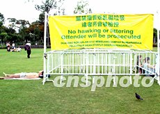 香港市民在“非典型肺炎”疫情放緩之際,暫且放下口罩走出戶外在公園草坪享受清新空氣.而宣傳檢控亂拋垃圾的廣告?zhèn)涫茏⒛。洪少?攝