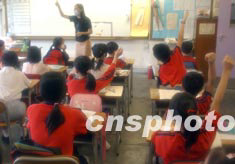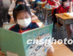 隨著香港“SARS”疫情的逐漸穩(wěn)定,香港數(shù)百所小學(xué)的高年級(jí)學(xué)生五月十二日開(kāi)始復(fù)課。在灣仔學(xué)校復(fù)課的第一天,老師向?qū)W生提問(wèn)有關(guān)如何防預(yù)“SARS”的基本知識(shí)。中新社記者 錢(qián)興強(qiáng) 攝