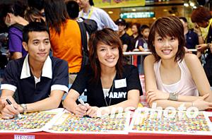 名歌星容祖兒、梁漢文及何韻詩(shī)18日在世貿(mào)中心為購(gòu)買門票支持善舉的歌迷簽名。
