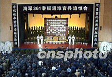 中國(guó)海軍361潛艇遇難官兵追悼會(huì)五月二十日上午在遼寧大連361潛艇所在部隊(duì)禮堂隆重舉行。1200名海軍官兵和部分親屬代表,為遇難官兵肅立默哀。作者:中新社