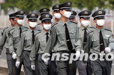 一群保安二十一日列隊(duì)走過北京街頭。盡管目前SARS疫情逐漸緩解,但有關(guān)方面提醒市民千萬不可麻痹大意、放松警惕。中新社記者:張煒
