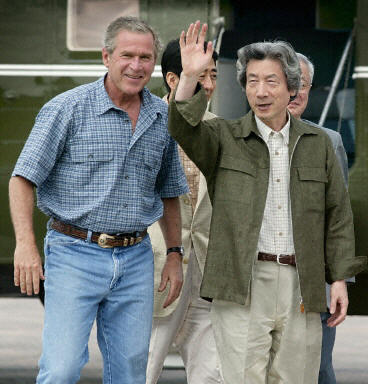 小泉與美國總統(tǒng)布什在得克薩斯州克勞福德的私人農(nóng)場舉行會(huì)談,兩國領(lǐng)導(dǎo)人將就伊拉克重建和朝鮮核問題等交換意見。
