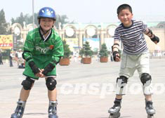兩名兒童二十四日清晨在北京展覽館廣場滑旱冰。隨著“非典”疫情逐漸緩解,北京的中小學生紛紛走出家門,參加各種戶外活動。中新社記者:趙振清
