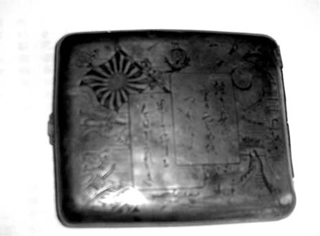 據(jù)年逾古稀的退休老干部高樓介紹,前不久,他在清理老岳父的遺物時,發(fā)現(xiàn)了這個日軍煙盒,請文物部門鑒定,證明是日軍侵華的又一罪證。該煙盒長90毫米,寬78毫米,厚11毫米,重71克,打開分上下兩個半盒,各可裝10支香煙。煙盒正面的圖文清晰,左右上方是兩面太陽旗,右上角一架飛機和左邊中下部一架飛機,一輛坦克,正底下兩艘軍艦,形成攻擊右邊的中國萬里長城之勢。