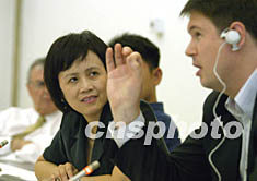 五月二十八日,由加拿大駐華大使館組織的中外記者突發(fā)事件經(jīng)驗(yàn)交流會在加拿大駐華大使館舉行,中外記者就SARS以及伊拉克戰(zhàn)爭報(bào)道交流經(jīng)驗(yàn)。圖為《財(cái)經(jīng)》雜志主編胡舒立(中)和國外記者交流SARA報(bào)道經(jīng)驗(yàn)。中新社記者 盛佳鵬 攝