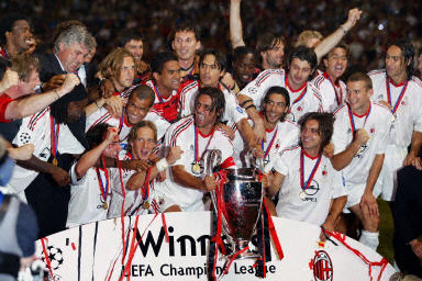 中新網(wǎng)5月29日電 在北京時(shí)間今天凌晨進(jìn)行的歐洲冠軍聯(lián)賽決賽中,意大利的AC米蘭隊(duì)在點(diǎn)球大戰(zhàn)中擊敗了意大利兄弟球隊(duì)尤文圖斯,登上了歐洲足球的最高峰。賽后,俱樂(lè)部主席、意大利總理貝魯斯科尼表?yè)P(yáng)了隊(duì)中球星們的出色表現(xiàn)。