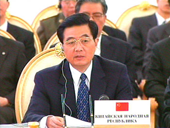 在金碧輝煌的亞歷山大廳,東道國俄羅斯總統(tǒng)普京、輪值主席國哈薩克斯坦總統(tǒng)納扎爾巴耶夫、首次出席峰會的中國國家主席胡錦濤和吉爾吉斯斯坦總統(tǒng)阿卡耶夫、塔吉克斯坦總統(tǒng)拉赫莫諾夫、烏茲別克斯坦總統(tǒng)卡里莫夫,圍坐在圓桌邊,按照俄文字母順序先后發(fā)言。