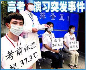 據(jù)北京青年報報道,昨天14點(diǎn)50分,101中學(xué)考點(diǎn)考生開始進(jìn)入考點(diǎn)。由老師扮演的考生一一走過“驗(yàn)證處”,老師進(jìn)行嚴(yán)密排查,不久,“忘帶健康卡”、“考前體溫超過37.3攝氏度”、“返京不足14天”、“有‘非典’接觸史”、“健康卡兩章不全”、“忘帶準(zhǔn)考證”等各種“問題考生”舉著醒目的標(biāo)牌,在引導(dǎo)老師的帶領(lǐng)下一一被臨時“安置”!皢栴}考生”的問題得到解決后,與其他考生一樣進(jìn)行體溫測試。進(jìn)入校門的考生在工作人員的指引下,先在臨時洗手池洗手消毒,然后按照考場示意圖去考場位置。