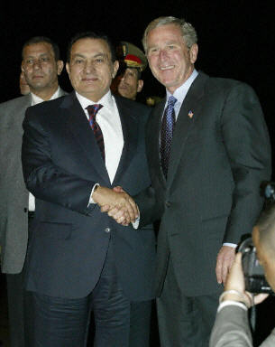 美國總統(tǒng)布什2日抵達埃及度假勝地沙姆沙伊赫,參加與阿拉伯領導人舉行的會議。這次會議旨在為巴勒斯坦新任總理阿巴斯提供支持。圖為埃及總統(tǒng)穆巴拉克(左)以及政府其他高層官員在沙姆沙伊赫機場迎接布什一行。
